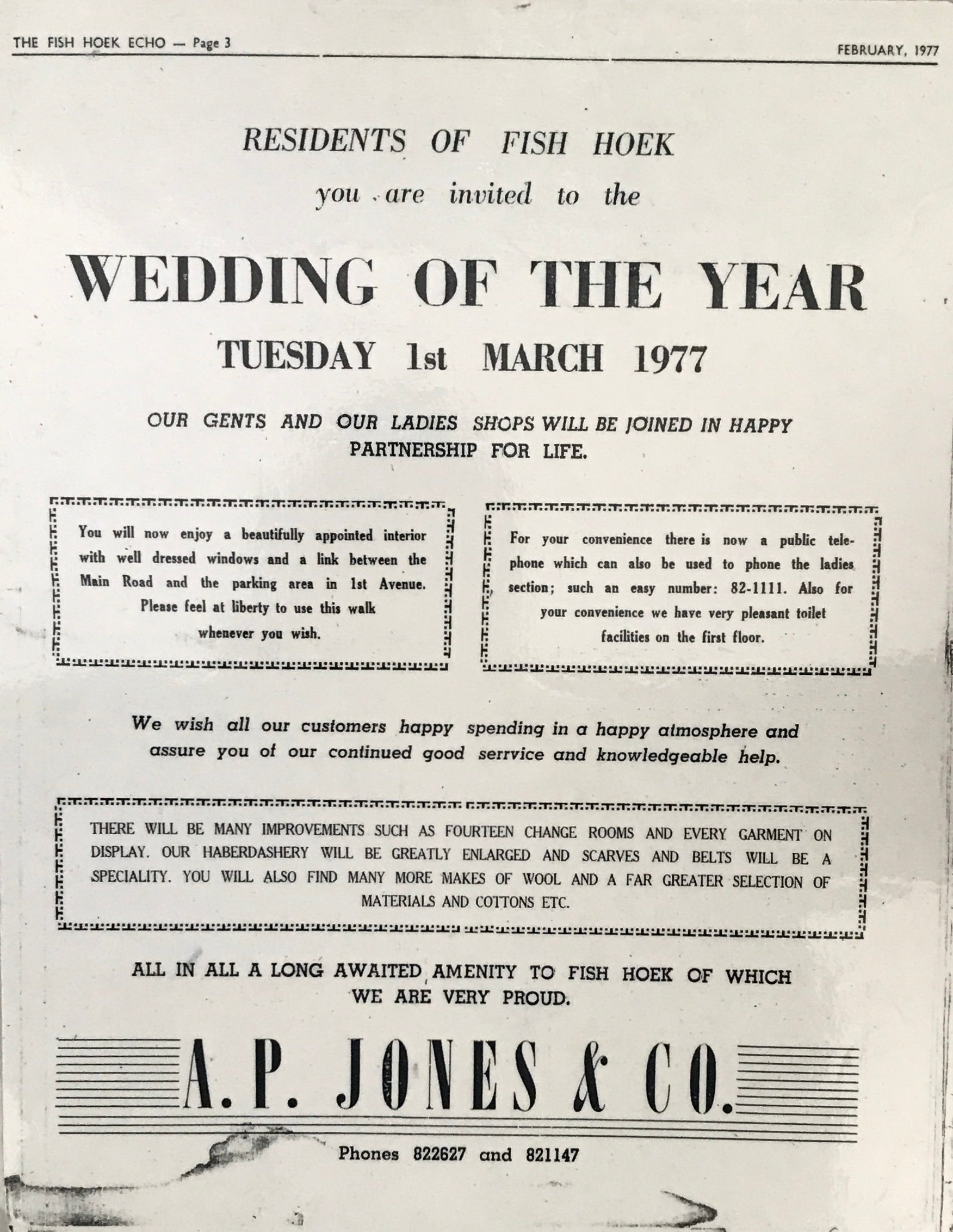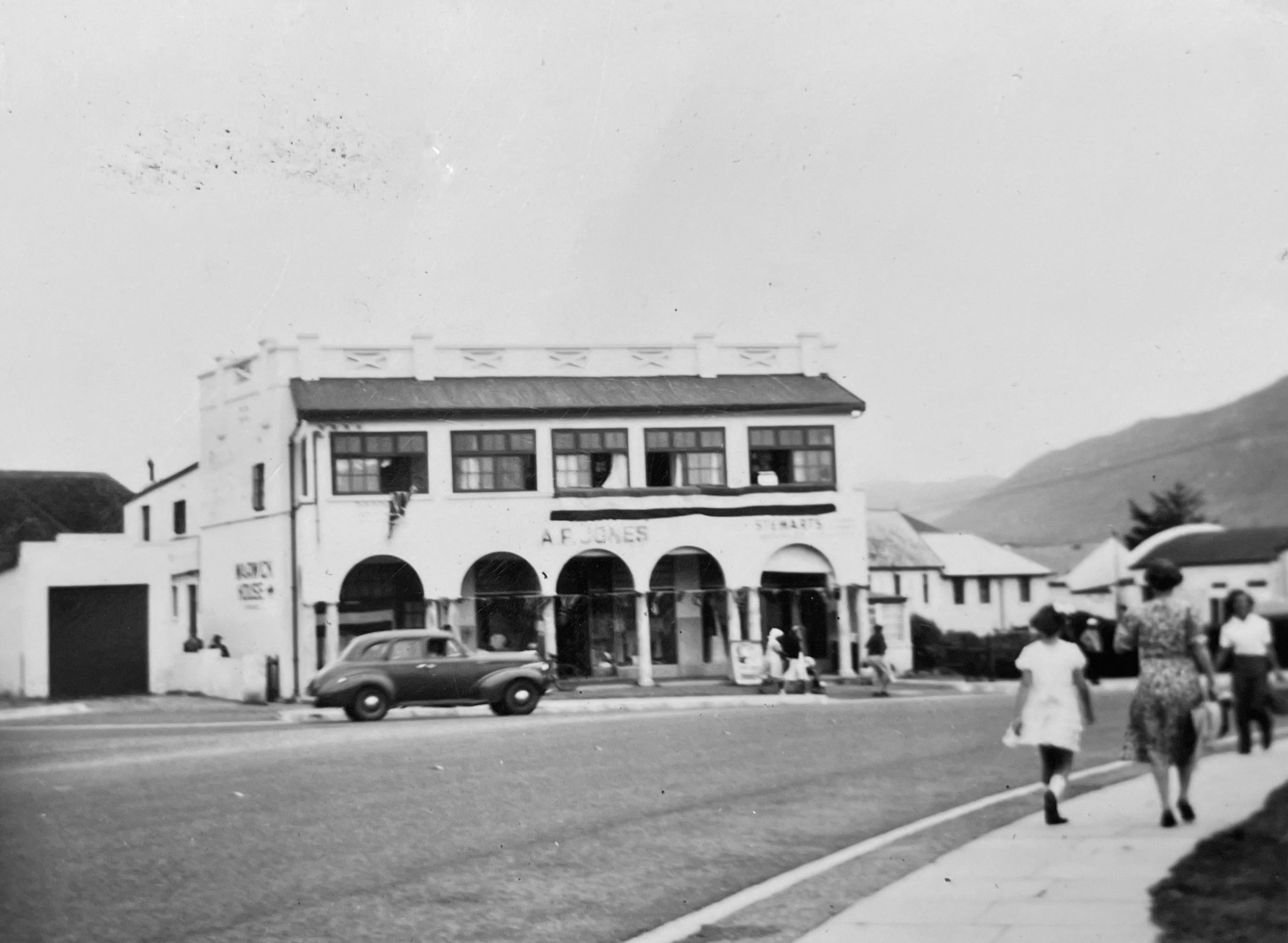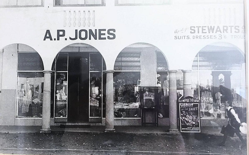 AP Jones started to sell ladies' and men’s wear and began to import material and thus expanded to become a shop with two doors, one opening into the grocery store and one into the soft goods. As Fish Hoek grew, the clothing and material departments became so popular that he sold the grocery side. At the age of 18, AP’s son Geoff joined the family business in 1948. Business continued to flourish and when a new building was erected on the corner of Central and Main Road, AP rented one of the shops and separated the men’s department from the ladies’. AP Jones survived the depression of the 1930s and moved to larger premises (the building where the store is now) in 1952 in order to expand. In 1957 AP’s daughter, Jenny, married Fritz Bing, a well-known sportsman who came in to manage the men’s department while Geoff stayed in the ladies’ with his parents.