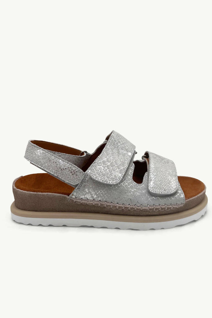Add a touch of shine to your everyday looks with the Rae Sandal. Designed in a striking silver snake finish, this sandal blends statement style with all-day comfort.