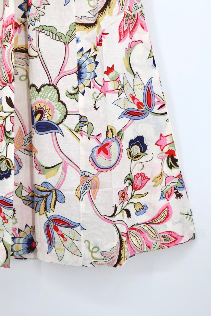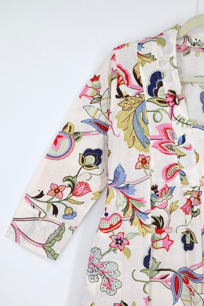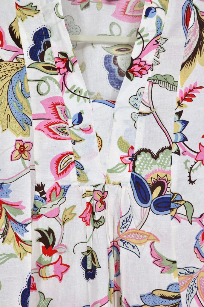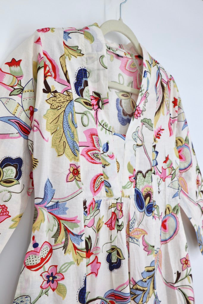 The V-Neck Long Dress in White Floral captures the essence of effortless summer style. Crafted from lightweight cotton, it drapes softly and allows the skin to breathe — perfect for warm, sunny days. The hand block-printed floral pattern adds a touch of artisanal charm, while subtle pleats create gentle movement and flow. Finished with 3/4 sleeves and a flattering V-neckline, this dress balances comfort with timeless elegance. Pair it with sandals or slides for a relaxed daytime look, or add statement earrings for a refined evening feel.
